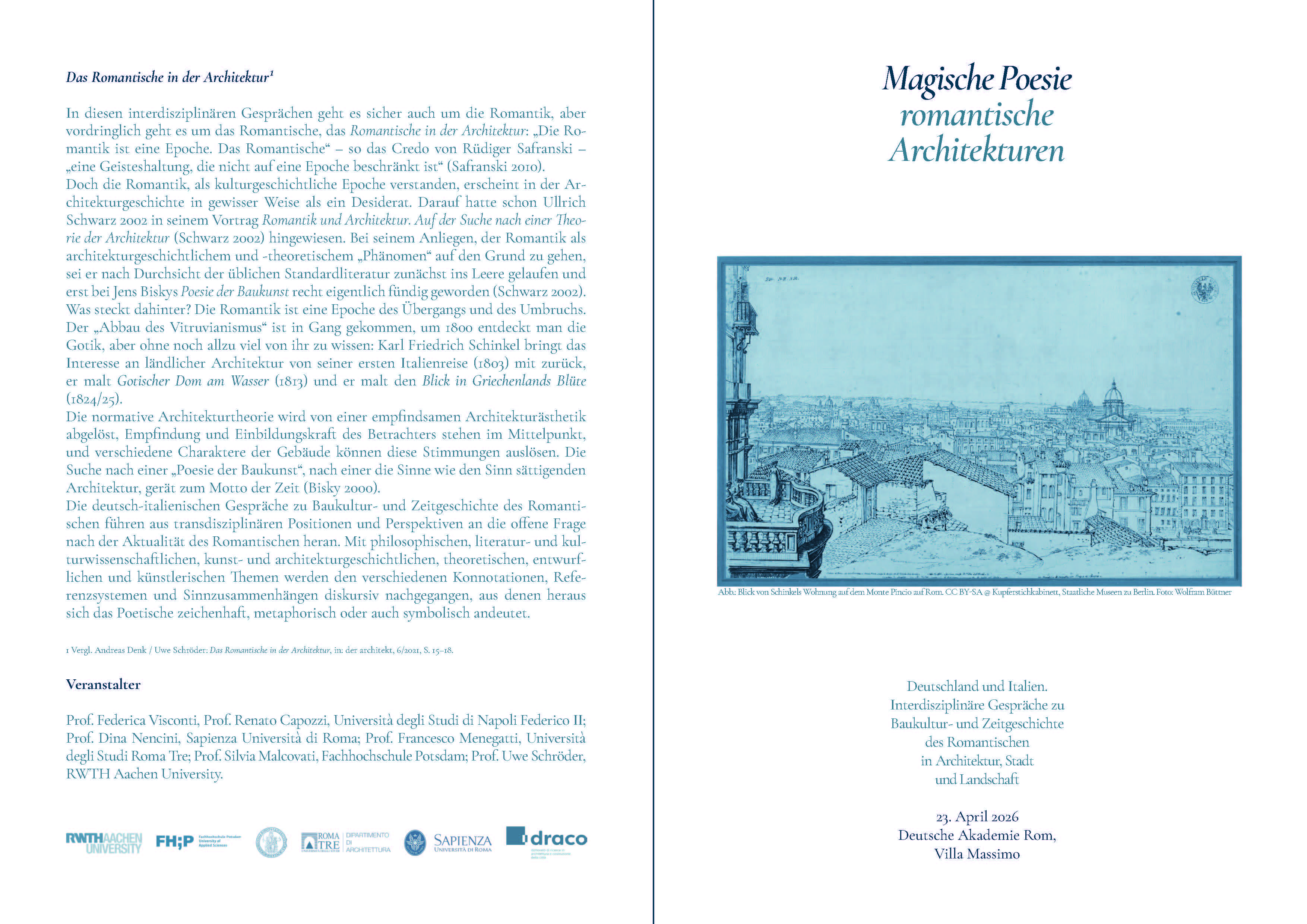 Die deutsch-italienischen Gespräche zu Baukultur- und Zeitgeschichte des Romantischen führen aus transdisziplinären Positionen und Perspektiven an die offene Frage nach der Aktualität des Romantischen heran. Mit philosophischen, literatur- und kulturwissenschaftlichen, kunst- und architekturgeschichtlichen, theoretischen, entwurflichen und künstlerischen Themen werden den verschiedenen Konnotationen, Referenzsystemen und Sinnzusammenhängen diskursiv nachgegangen, aus denen heraus sich das Poetische zeichenhaft, metaphorisch oder auch symbolisch andeutet.