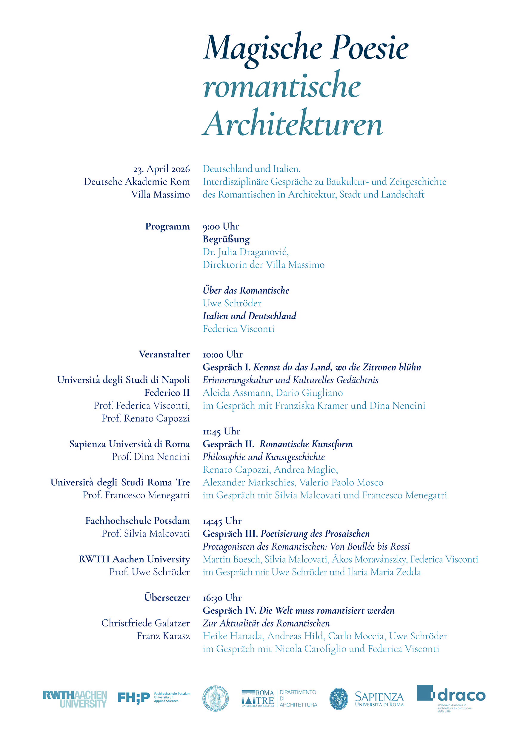 Prof. Federica Visconti, Prof. Renato Capozzi, Università degli Studi di Napoli Federico II; Prof. Dina Nencini, Sapienza Università di Roma; Prof. Francesco Menegatti, Università degli Studi Roma Tre; Prof. Silvia Malcovati, Fachhochschule Potsdam; Prof. Uwe Schröder, RWTH Aachen University.