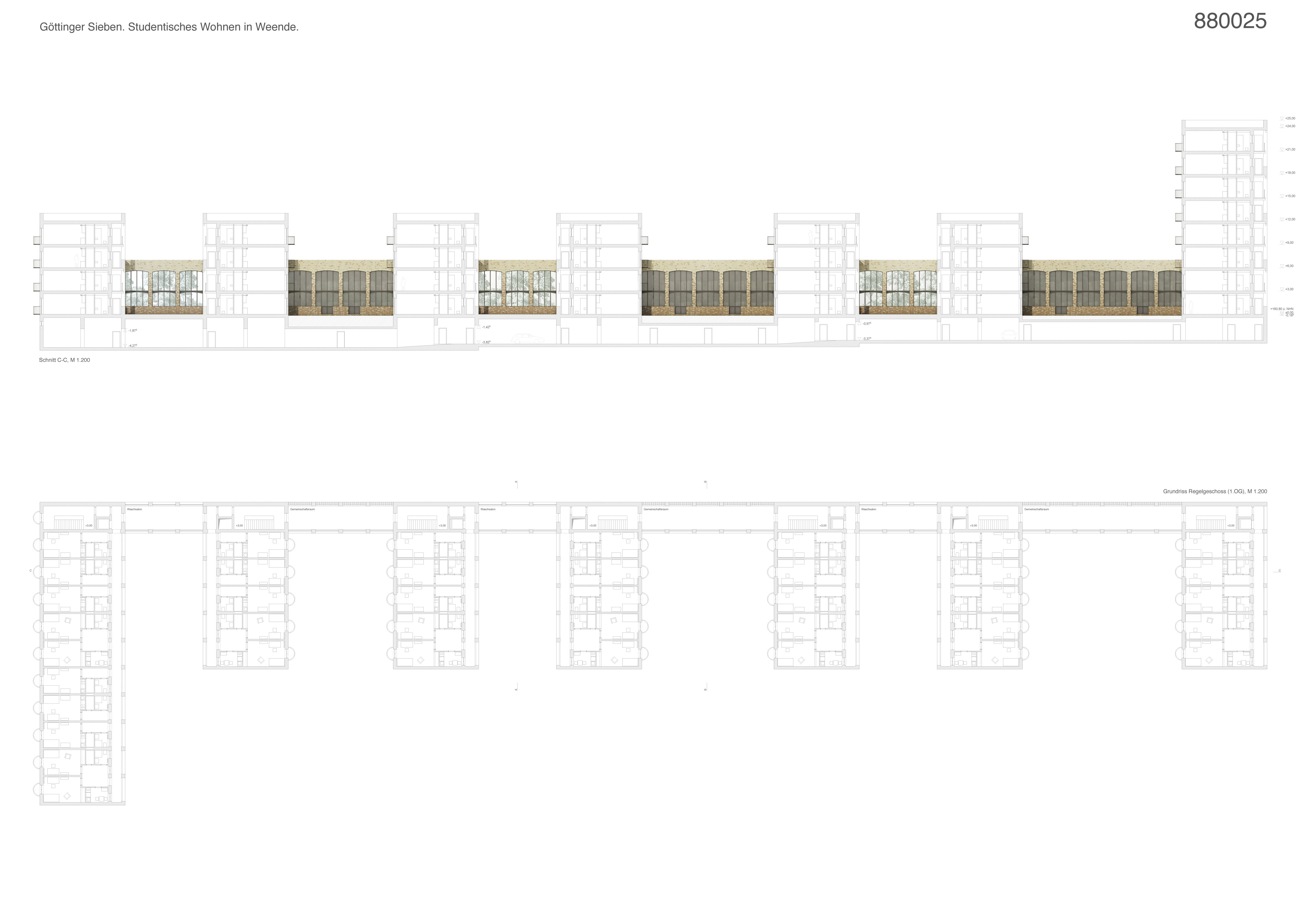 Das studentische Wohnen interpretiert der Entwurf als ein gemeinsames und gemeinschaftliches Wohnen. Nach Osten und nach Westen sind die Zimmer der Ein- oder ggf. auch Zweiraumwohnungen mittels der Balkone zu den „inneren“ Gärten orientiert. Die Lage erlaubt den Wohnenden weitest gehenden Rückzug für ein ungestörtes Studieren.