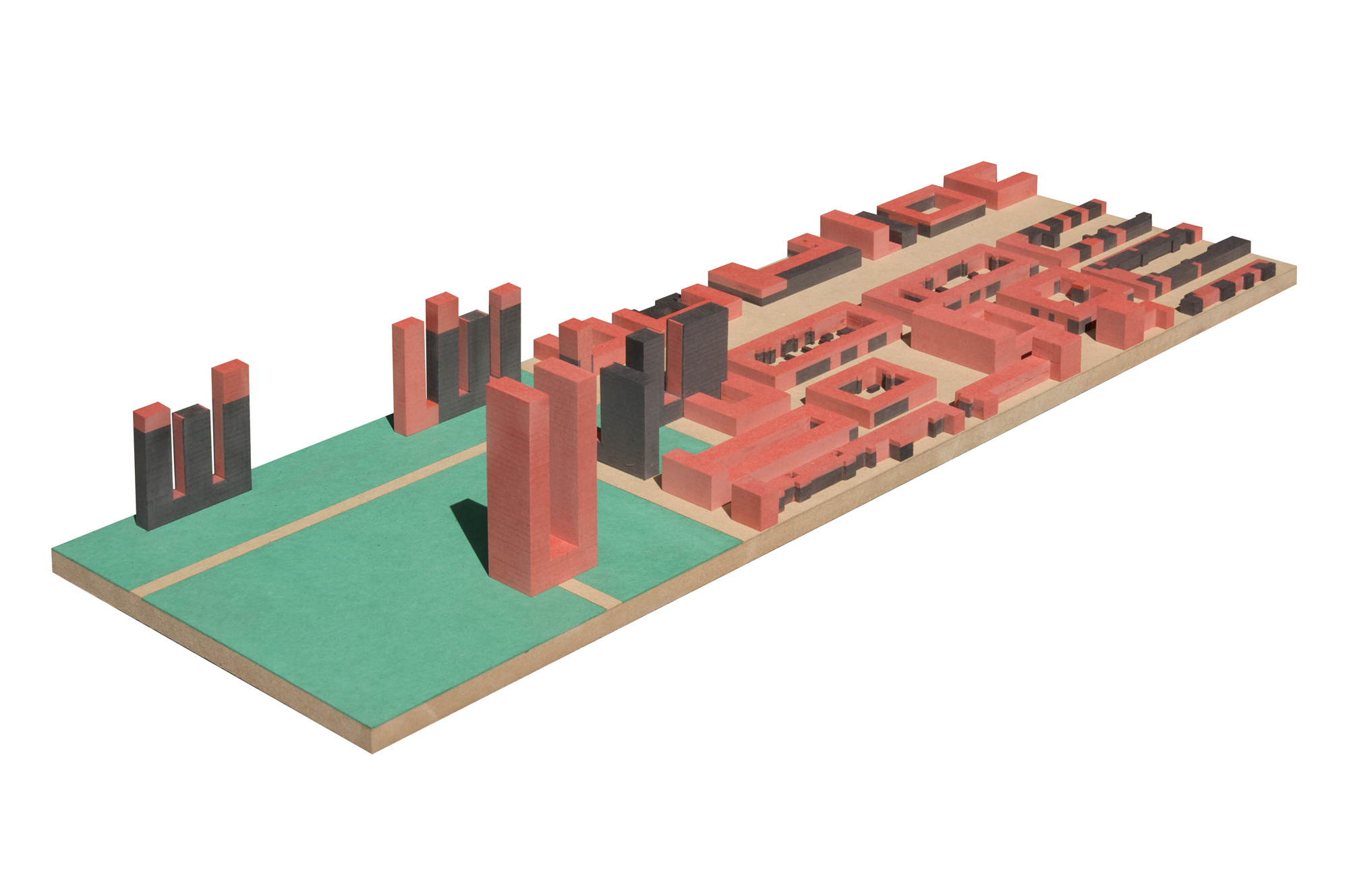 The plan illustrating our idea should be read as an ideography, as a spatial scenario and not as an urban plan. In this ideography we interpreted the Linkeroever as a general spatial condition we generally find in the periphery of the contemporary European City, and as such we try to show how in such circumstances some spatial order and urban form might be created by making a clear distinction between two spatial identities: 'space defined by objects, or space within volumes' and 'space surrounding objects, or space between volumes'.